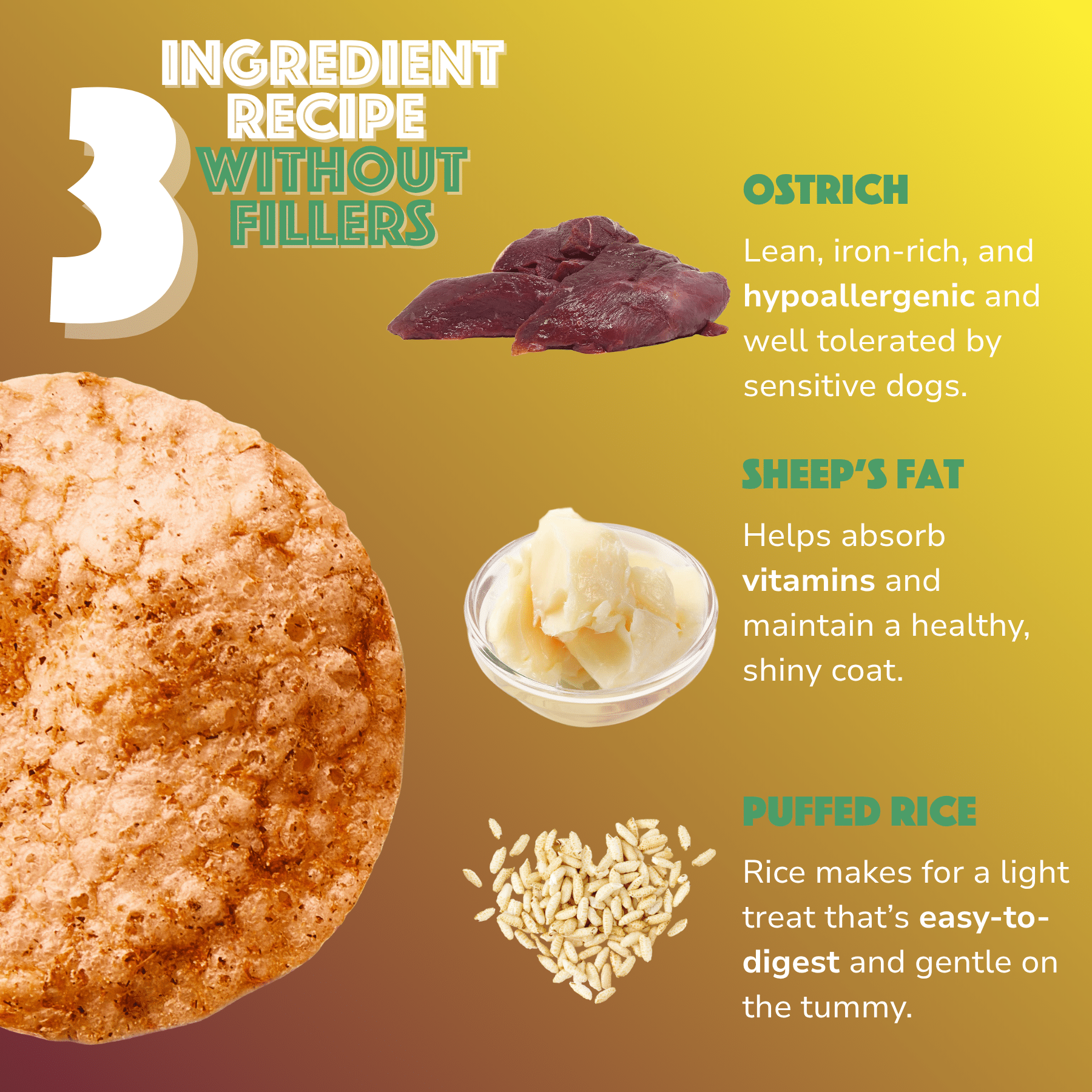 Composition: rice (90%), ostrich (8%), sheep’s fat.