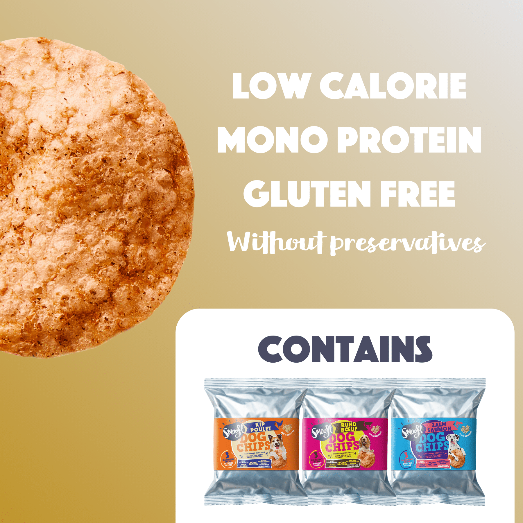A joyful snack box with four flavours of our crunchy Dog Chips:
